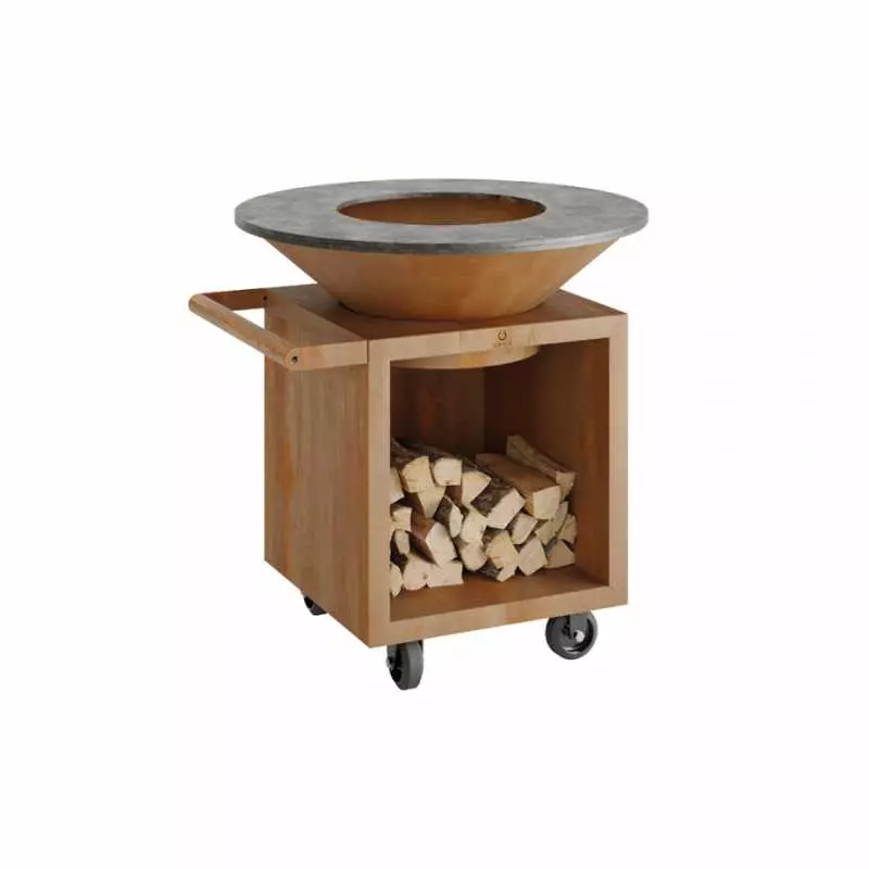 Il dispose d'un espace idéal pour ranger du bois ou des accessoires. Il est composé d'une base, d'un socle d'un mètre de diamètre, d'une grille et d'un étouffoir. Sur roulettes et disposant d'une grande plancha circulaire, ce produit convient parfaitement pour des réceptions en extérieur.